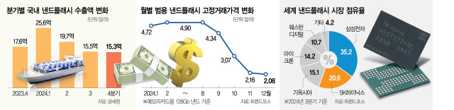 지난해 4분기 한국의 낸드플래시 해외 수출액이 10% 넘게 줄어든 것으로 나타났다. 인공지능(AI) 서버용 낸드플래시 판매량은 견조한 성장을 이어갔지만 전자기기·스마트폰 등 주요 매출원에서 수요가 정체되면서 성장이 둔화했다. 올해 낸드 시장에서도 비슷한 기조가 이어질 것으로 관측되자 세계 1·2위 낸드 제조사인 삼성전자와 SK하이닉스도 공급량 조절을 검토하고 있다.