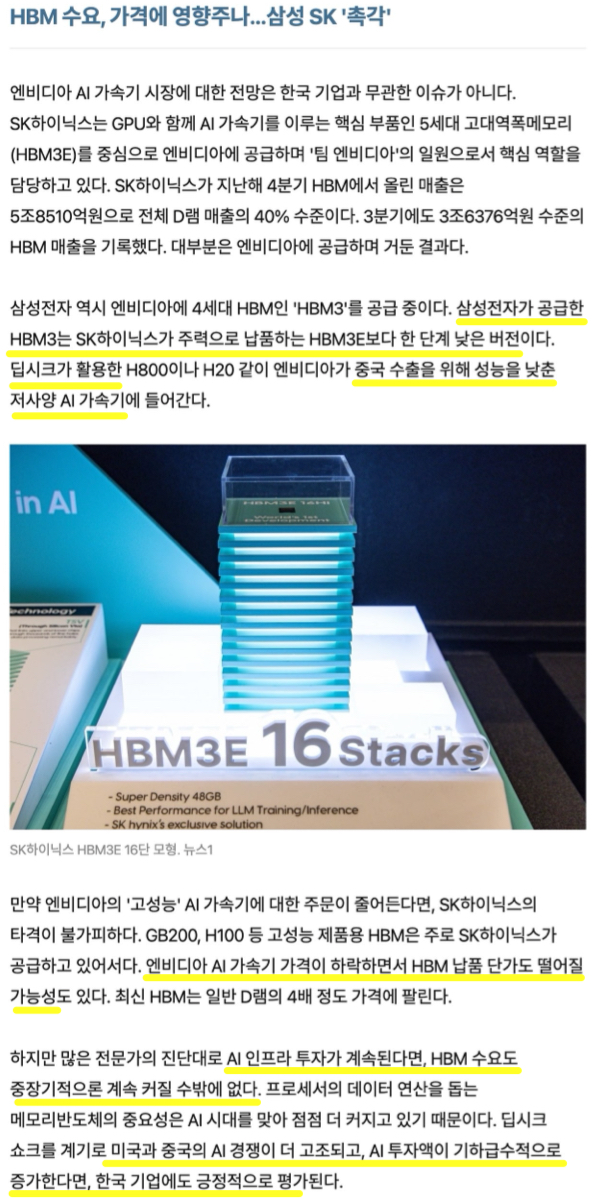 딥시크가 HBM 시장도 흔든다…SK하이닉스·삼성전자 '촉각' [황정수의 반도체 이슈 짚어보기], 韓 반도체 위기 요인 진단 (3) 딥시크, AI 반도체 판 흔드나 엔비디아 주가 17% 급락 낮은 사양 칩으로 A