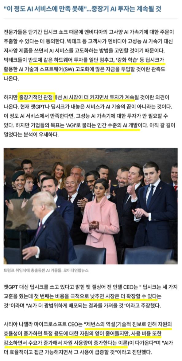 "중국 기업의 딥시크 출시는 미국 기업들에 경종(wake up call)이 될 것, 경쟁에서 승리하기 위해서는 초집중할 필요가 있다" - 트럼프
