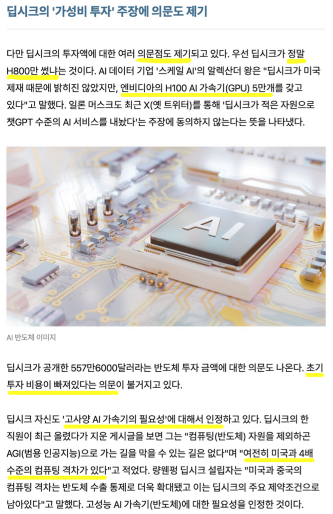 딥시크가 공개한 AI 모델은 고성능, 고가의 AI 반도체(H100)를 사용한 Open AI의 모델보다 고성능을 출력하지만 저가형 AI 반도체를 사용했다는 점에서 화제가 되고 있다.