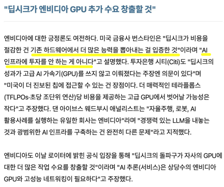 이는 단기적으로 고성능 AI 반도체를 제조하는 NVIDIA와 SK Hynix에게 불리할 수 있지만, 장기적으로 AI 기술의 상용화가 가속화될 수 있음을 시사한다.
