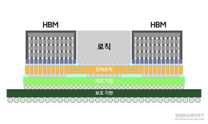 AI 가속기에 적용되는 2.5D 패키징 구조. 로직(GPU)와 고대역폭메모리(HBM) 간 연결이 '인터포저'를 통해 이뤄진다. AMD는 이 인터포저를 기존 실리콘 소재에서 유리로 대체하려는 중이다. (사진=삼성전자)