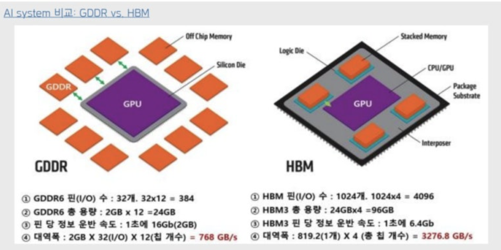 (2) interposer(인터포저) : 반도체 칩 간 신호와 전력을 연결하는 다리 역할 (HBM + GPU에서 중간 다리 역할)