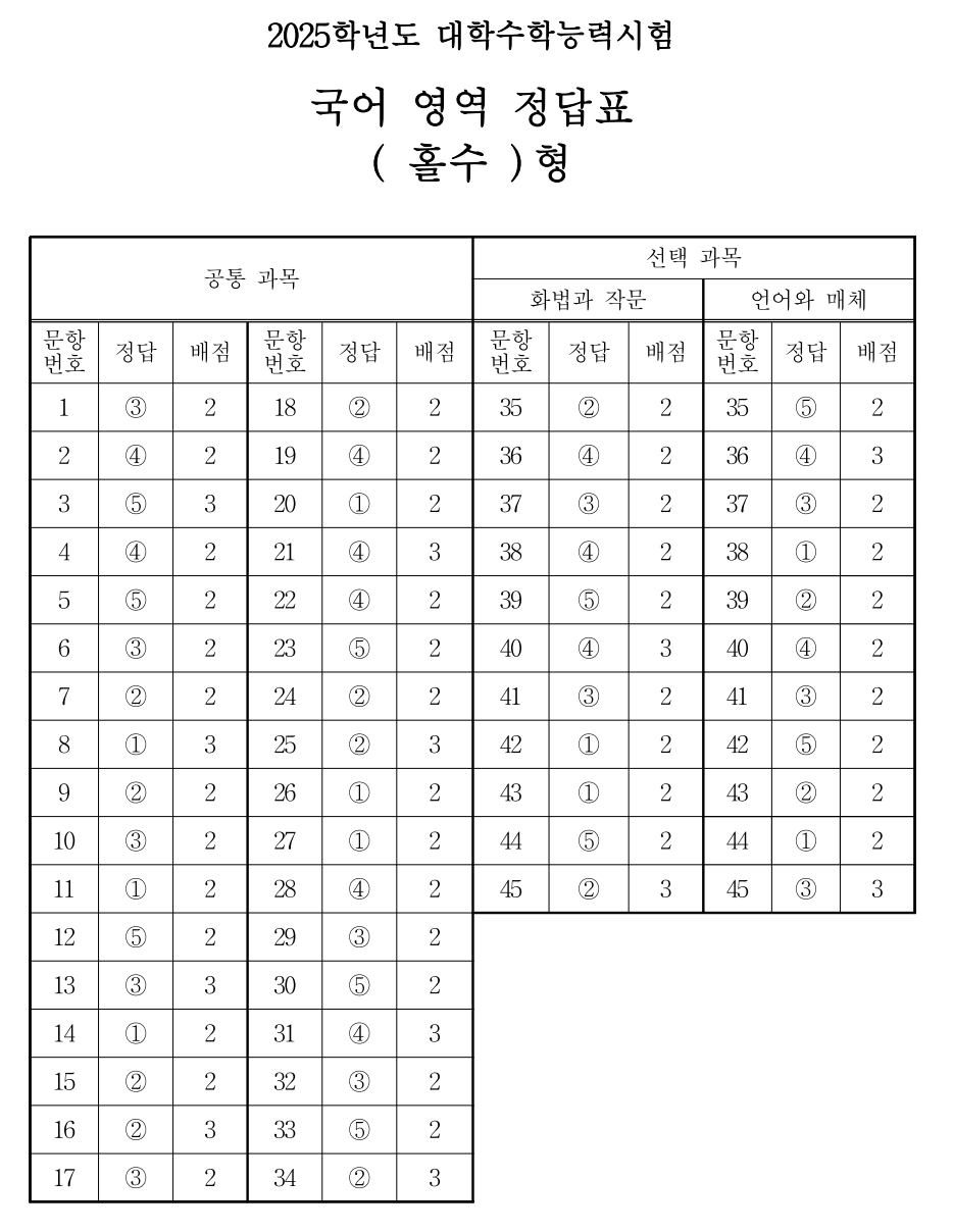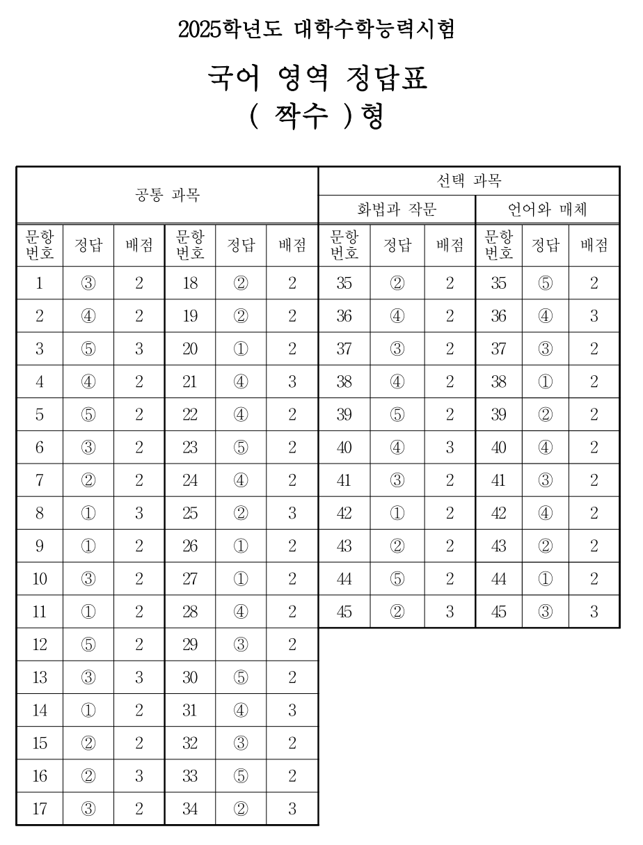 <2025학년도 수능 국어영역 정답 다운로드>