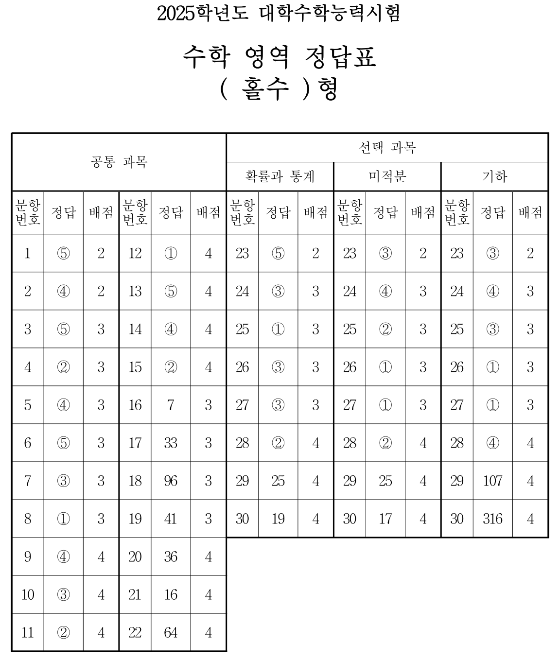 <2025학년도 수능 수학영역 정답 다운로드>